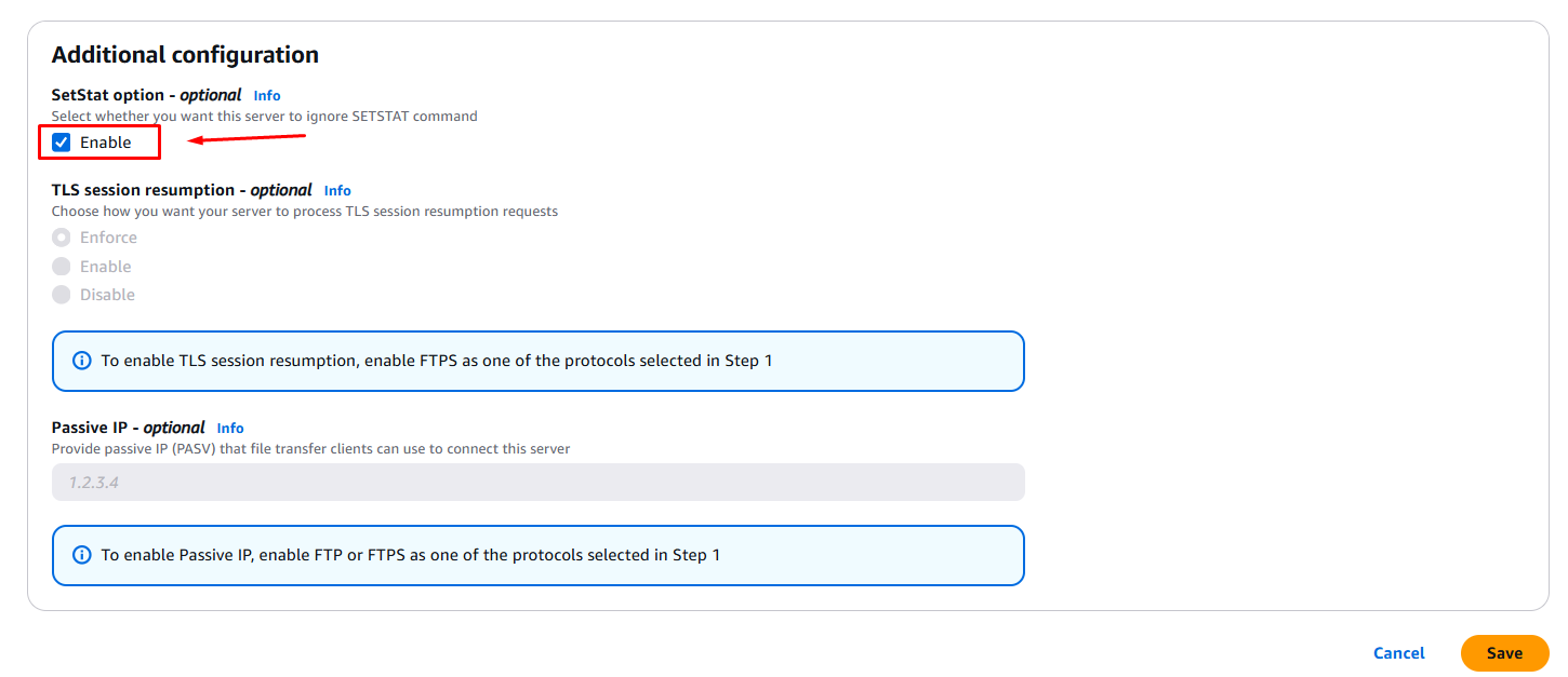 Transfer Family โ Select server โ Edit โ Find SetStatOption โ Set to ENABLE_NO_OP