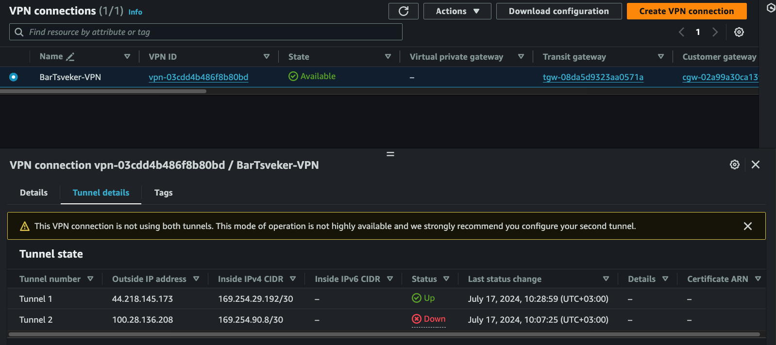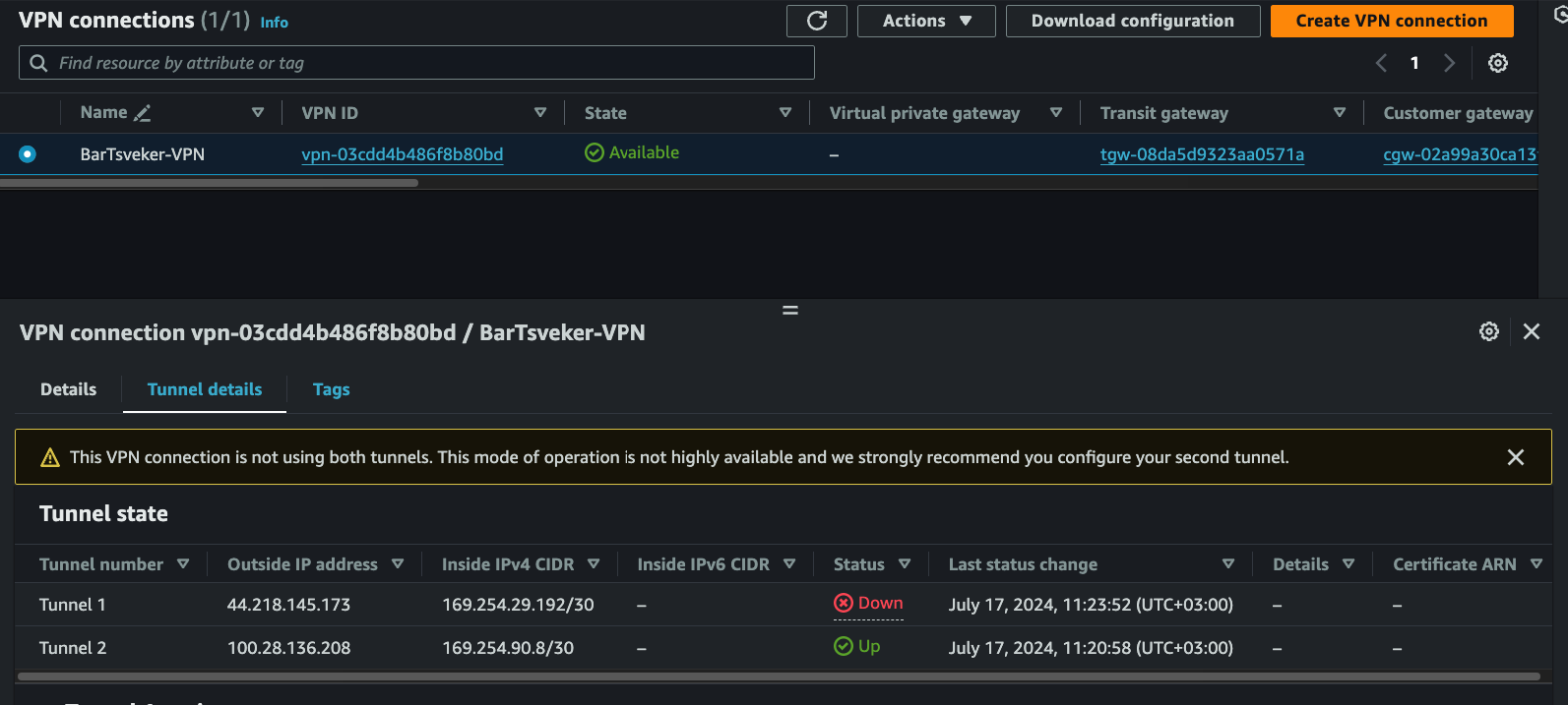 AWS provisions two tunnels for redundancy. Test failover by switching: