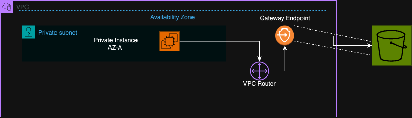 A gateway endpoint is a route table entry that sends S3 traffic directly to S3 via AWS's internal network. No NAT, no internet gateway, no public IPs. Your instance makes an S3 API call, the route table sends it to the endpoint, and S3 responds on the same path.